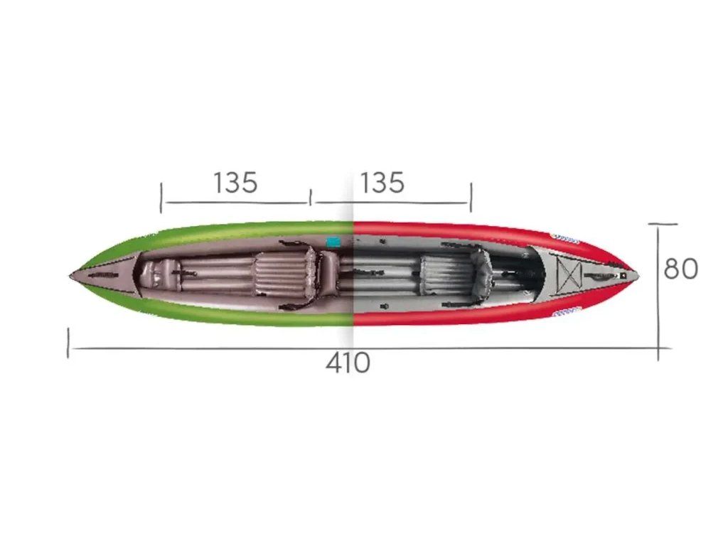 - Tandem: Klasická verzia pre dvoch dospelých vodákov s dostatočným priestorom na nohy.