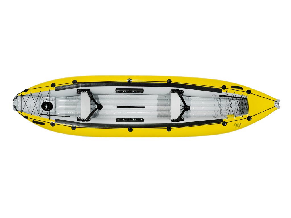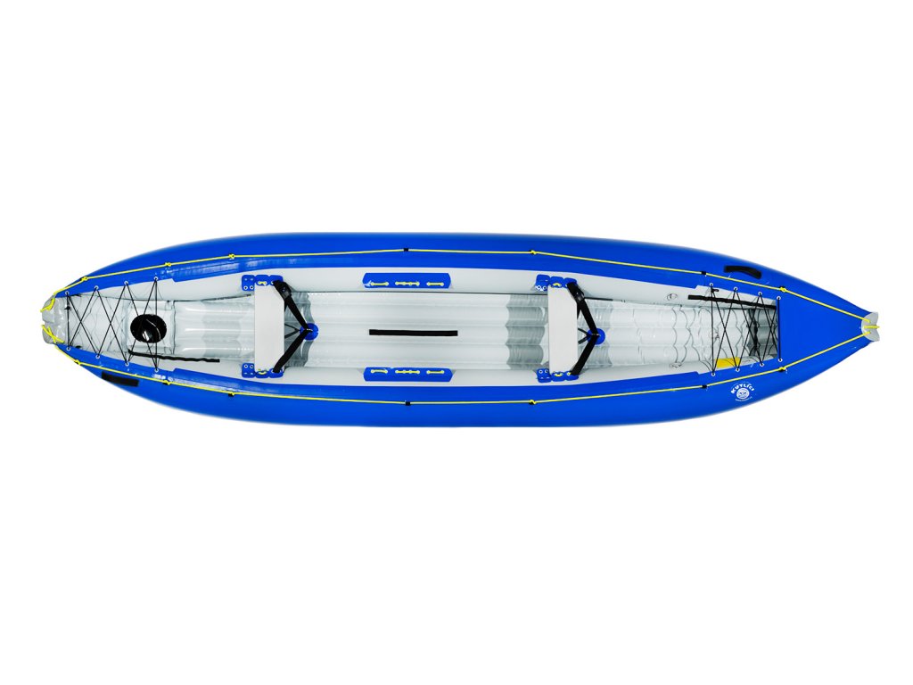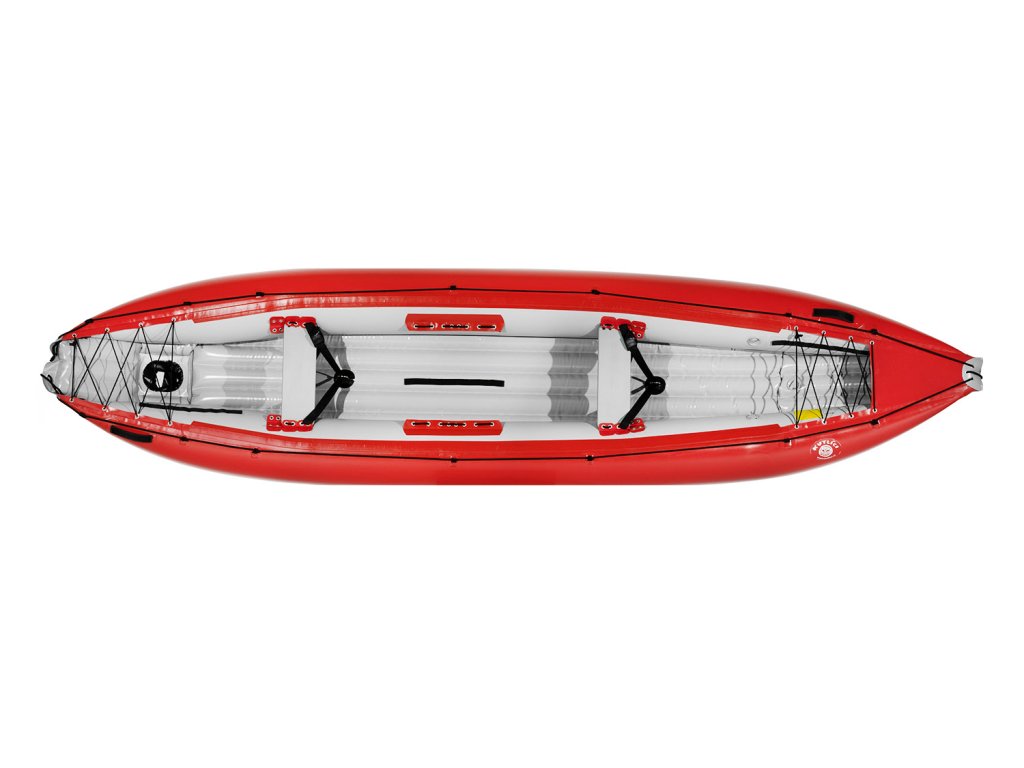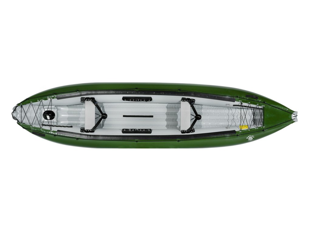 Trup kanoe je navrhnutý pre maximálnu stabilitu v perejách a dobrú ovládateľnosť aj pri plnom zaťažení. Široký profil (103 cm) a ploché dno poskytujú pevnú oporu, zatiaľ čo dĺžka 410 cm zabezpečuje dobrú rýchlosť a držanie smeru na pokojnej vode. Konštrukcia a materiály od európskych výrobcov spĺňajú normy EÚ, čo zaručuje dlhú životnosť a vysokú spoľahlivosť.